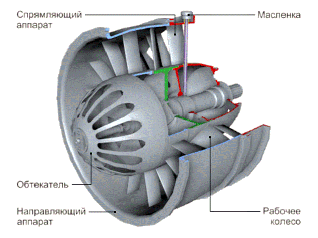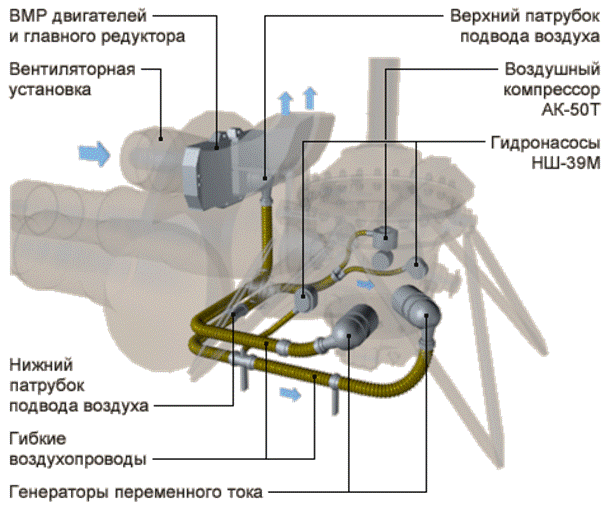 На вертолете установлен вентилятор осевого типа, основными узлами и деталями которого являются направляющий аппарат, рабочее колесо, вал вентилятора в сборе, спрямляющий аппарат. Подшипники вала вентилятора смазываются смазкой ОКБ-122-7, которая вводится в подшипниковый узел через масленку. Основные технические данные вентилятора (при положении шлица на риске «Л» (лето) и температуре наружного воздуха +40 °С): Мощность, потребляемая вентилятором... не более 43,14 кВт Масса вентилятора......... 18,6 кг