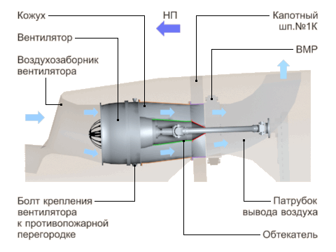 Вентиляторная установка вертолета состоит из вентилятора, наружного и внутреннего кожухов и карданного вала привода вентилятора. Крепится вентиляторная установка фланцем наружного кожуха к шпангоуту №1К и снизу через кронштейн поддерживается подкосом продольной противопожарной перегородки. Доступ для смазки заднего кардана гипоидным маслом осуществляется через редукторный отсек, а для смазки переднего карданного шарнира в наружном и внутреннем кожухах вентилятора предусмотрены лючки с крышками, запираемыми винтовыми замками.