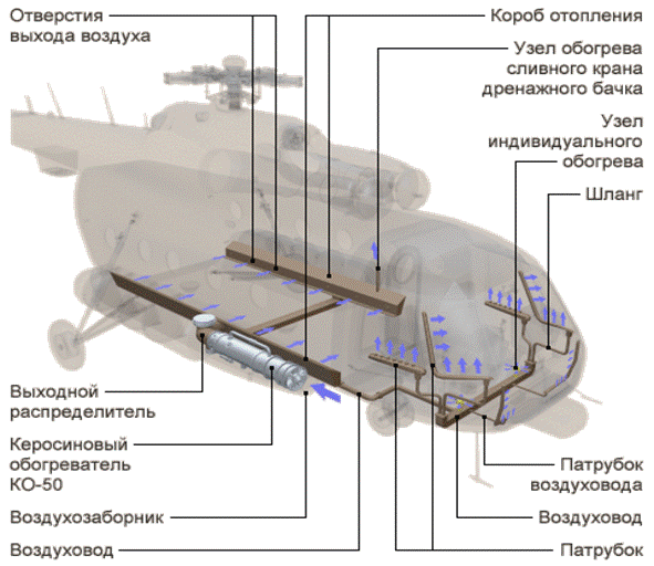 Вертолет оборудован системой отопления и вентиляции, обеспечивающей подачу подогретого или наружного (в режиме вентиляции) воздуха в грузовую кабину и в кабину пилотов с целью поддержания в них нормальных температурных условий. Кроме того, система отопления и вентиляции обеспечивает обдув стекол и сдвижных блистеров кабины экипажа, обогрев фильтра отстойника воздушной системы (для вертолетов до 1980 г. выпуска) и сливного крана дренажного бачка топливной системы. Основным агрегатом системы является керосиновый обогреватель КО-50, установленный с внешней стороны правого борта фюзеляжа.