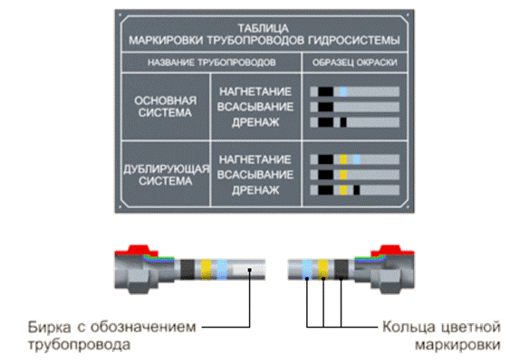 Трубопроводы гидросистемы выполнены из стальных трубок, трубок из алюминиевого сплава и гибких рукавов. Все трубопроводы при изготовлении испытываются на прочность гидравлически: стальной трубопровод - давлением 120 кгс/кв.см, а трубопровод из алюминиевого сплава - давлением 30 кгс/кв.см. Все трубки окрашиваются в серый цвет и имеют маркировочные кольца, нанесенные цветной эмалью.