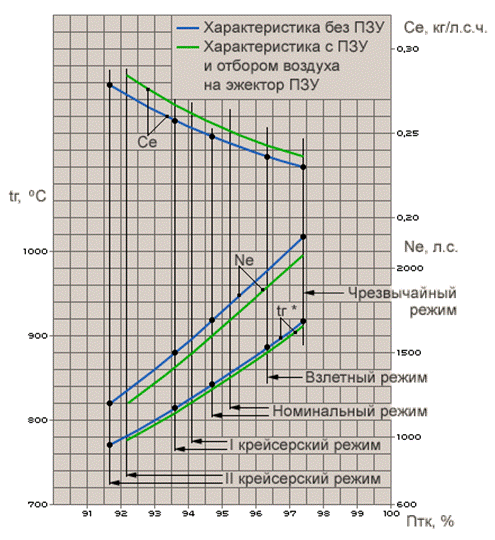 Примечание: При отказе на взлетном режиме электронной части системы регулирования максимально допустимая замеренная частота вращения ротора ТК составляет 102,5%. Дроссельная характеристика двигателя ТВ3-117ВМ