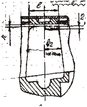 ПРИМЕЧАНИЕ: Прикомлевые части лопаток 7 и 8 ступени при осмотре ЭЛЖ недоступны. ВНИМАНИЕ! При проворачивании ротора смотровую трубку устанавливать в положение исключающее возможность ее повреждения. Не допускается: Обрывы лопаток, загибы и надрывы на лопатках. В случае обнаружения износа лопаток 7 и 8 ступени компрессора, произведите замер износа лопаток 1 ступени. Не допустимый износ лопаток 7 и 8 ступени ротора компрессора определять как износ торцев более половины видимой ширины l лопатки (см. рисунок), или глубиной более 2 зазоров (h), между торцем изношенной части и внутренней поверхностью статора компрессора. После выполнения работ удалить остатки старой прокладки 4 с фланца 9 и обезжирить поверхность фланца и заглушки 2 спиртом или бензином. Смазать новую прокладку силоксановой эмалью. Установить на фланец заглушку, закрепив ее винтом 1