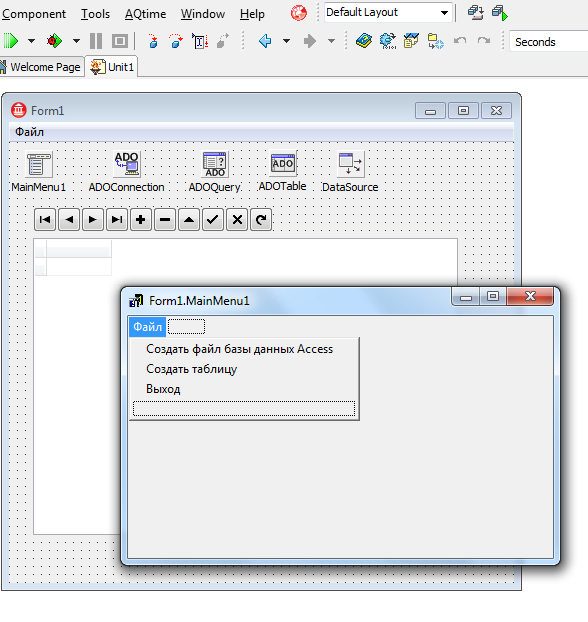 Компоненты ADOCommand и ADODataSet связываются с источником данных посредством объекта ADOConnection, указывая ссылку на него как значение свойства Connection. Для идентификации соединения необходимо определить значение свойства ConnectionString (строка соединения) компонента ADOConnection. Реализацию доступа к данным через ADO проще всего рассмотреть на примерах. Откроем обычный проект Delphi и сохраним его в личном каталоге. Перенесём на него компоненты, необходимые для доступа к таблице базы данных и отображения информации (рисунок 2). Страницы палитры компонентов, на которых располагаются компоненты, показаны на рисунках 3,4 и 5.