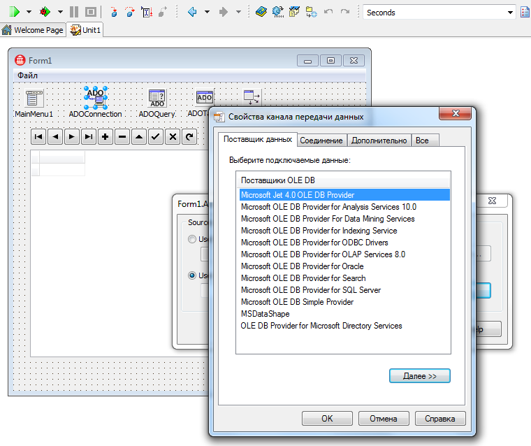 Теоретические сведения к работе. Компанией Microsoft был предложен механизм доступа к данным ActiveX Data Objects (ADO). ADO – это набор библиотек, содержащих СОМ-объекты, реализующие прикладной программный интерфейс для доступа к данным и используемые в клиентских приложениях. ADO становится всё более популярным способом доступа к данным, так как включён в ядро операционных систем семейства Windows, и входит в состав таких популярных продуктов, как MS Office и MS Internet Explorer. Все таблицы базы данных хранятся в одном файле (в отличие от Paradox и Dbase) и не требует при этом запущенного сервера баз данных. Приложение баз данных, построенное по технологии ADO, взаимодействует с источником данных при посредстве провайдера. Очень важную роль играют провайдеры ADO, координирующие работу приложений с хранилищами данных различных типов. Провайдер знает, какие данные и где расположены, умеет обращаться к данным с запросами и интерпретировать возвращаемую служебную информацию и результаты запросов для передачи приложениям. При установке соединения через соответствующие компоненты становится доступен список установленных в операционной системе провайдеров. В модуль данных (или в форму) добавляется компонент источника данных (TDataSource), являющийся связующим звеном между набором данных и элементами управления, отображающими данные. Свойство DataSet компонента типа TDataSource указывает набор данных, формируемый компонентами таких классов, как TADOTable или TADOQuery. В форму добавляются элементы управления для работы с данными, такие как TDBGrid, TDBEdit, TDBCheckbox и т.п. Они связываются с источником данных через свойство DataSource или DataSource и DataField.