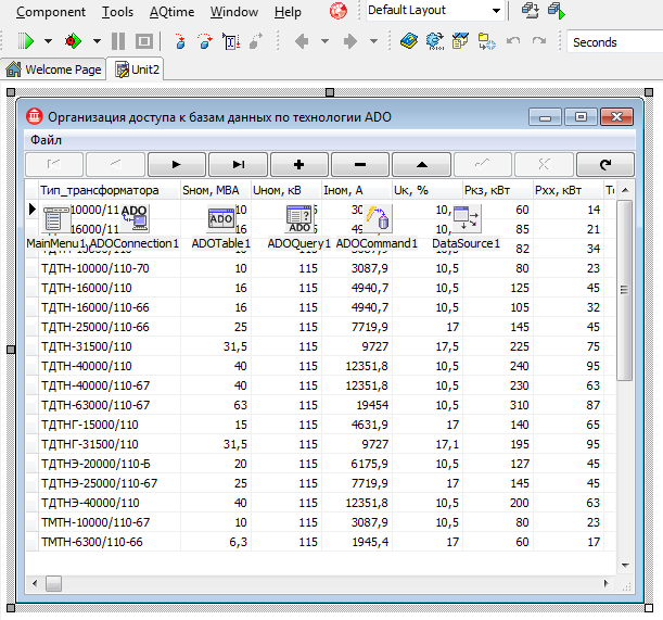 Рисунок 9.Интегрированная среда разработчика. По технологии ADO получен доступ к реляционной таблице базы данных, содержащей параметры понижающих трансформаторов тяговых подстанций.