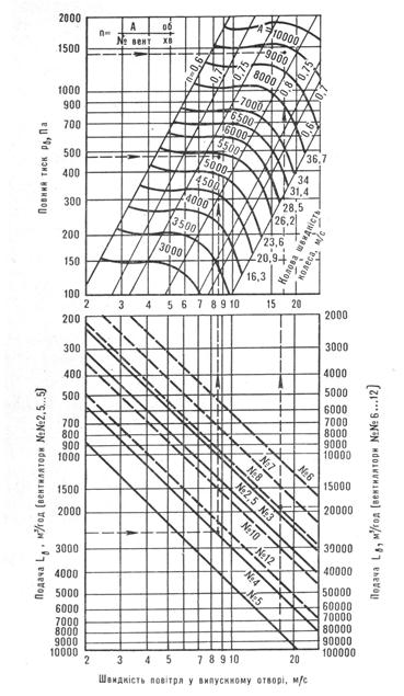 Втрати тиску на витікання повітря через вихідний отвір повітропроводу з швидкістю υвих визначають за формулою: Δрвих= де μ — коефіцієнт витрати; (μ=0,65; для отворів з козирком μ=0,69); υвих=7...12 м/с. Характеристики вентиляторів у довідковій літературі подаються для так званих стандартних умов. Тому втрати тиску, обчислені, як правило, для умов, що відрізняються від стандартних, мають бути приведені до стандартних за формулою: Δро=Δр де Δро— втрати тиску приведені до стандартних умов, Па; t—температура повітря в повітропроводі; °С; to, Bo— температура та барометричний тиск при стандартних умовах (to=20°С; Во=0,1013 МПа); В — барометричний тиск атмосферного повітря в місцевості, де експлуатується вентиляційна система, МПа. Вентилятори підбирають за зведеними або індивідуальними характеристиками (рис. 10.2). На зведеному графіку р—L характеристик вентиляторів знаходять точку, абсциса якої відповідає розрахунковій подачі, приведеної до стандартних умов, а ордината — розрахунковому тиску, приведеному, також, до стандартних умов, а ордината — приведеному також до стандартних умов.