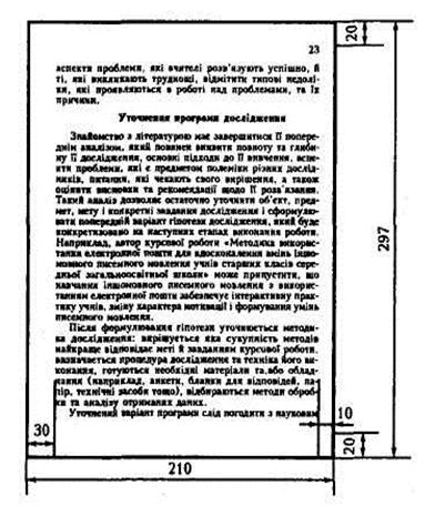 При підготовці рукопису слід дотримуватися правил переносу, викладених в «Українському правописі» (див. Список рекомендованої літератури). Зокрема, не можна: 1) розривати буквоспослучення, яким передається на письмі один звук (ра – джу, а не рад – жу); 2) відривати одну букву від кореня, префікса (роз –дати, а не ро –здавати); 3) залишати на попередньому рядку або переносити 4) розривати цифрові записи і скорочені слова при них, а також умовні графічні скорочення типу та ін. (2002 p., а не 20 – 02 р. чи 2002 – p.); 5) розривати односкладові частини складноскорочених слів, зокрема ініціальні й комбіновані абревіатури (ДФС – України, а не Д – ФС України, опер – уповноважений, а не опе – руповноважений); 6) переносити прізвища, залишаючи в кінці попереднього рядка ініціали або інші умовні скорочення (проф., – акад. тощо), які до них належать; 7) залишати біля попередньої букви м’який знак або 8) залишати в попередньому рядку одно-, дво- або ТЕХНІЧНЕ ОФОРМЛЕННЯ РОБОТИ Курсова робота, яка подається науковому керівнику, має бути акуратно оформлена. Іноді курсанти нехтують цією вимогою, вважаючи, що головним є зміст і літературне оформлення роботи. Проте така позиція є неправильною. Якість оформлення роботи — це перше, що помічається при читанні, і це перше враження може суттєво позначитися на загальній оцінці роботи. Змістовна, але неохайно оформлена курсова робота не може претендувати на високу оцінку. Тому, складаючи графік виконання курсової роботи, слід виділити досить часу на її технічне оформлення. Текст відредагованої курсової роботи потрібно писати акуратним, чітким почерком або надрукувати машинописним способом чи за допомогою комп’ютера на одній стороні стандартних аркушів білого паперу форматом А-4 (203 х 288 мм або 210 х 297 мм). Якщо рукопис друкують машинописним способом, шрифт має бути чітким, стрічка чорного кольору, середньої жирності. Якщо роботу друкують за допомогою комп’ютера, використовують шрифт Times New Roman текстового редактора Word, розмір 14, з полуторним міжрядковим інтервалом. Мінімальна висота друкованого шрифту – 1,8 мм. Кожна сторінка друкованої курсової роботи має містити приблизно 1800 знаків (28–30 рядків по 62–65 знаків у рядку, враховуючи знаки пунктуації та пробіли між словами). Навколо тексту залишають поля таких розмірів: зліва – не менше 30 мм, справа – не менше 10 мм, знизу й зверху – не менше 20 мм (рис. 12.).