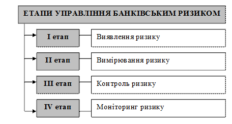 Важливим елементом у забезпеченні фінансової стійкості комерційного банку є управління ризиками. Банки здійснюючи банківські операції з метою одержання прибутку наражаються на ризики. Тому, необхідно належним чином управляти рівнем ризиків та контролювати його. Ризики банківської діяльності також мають оцінюватися з погляду на їхнє значення. Таке оцінювання має проводитися постійно. Деякі ризики є невід’ємною частиною банківської діяльності. У банківському секторі накопичено велику кількість знань про те, як визначати, вимірювати, контролювати ці притаманні банківській справі ризики та здійснювати їх моніторинг. У контексті нагляду на основі оцінки ризиків Нацбанк визначає банківський ризик за його впливом на капітал і надходження. Ризик – це ймовірність того, що події, очікувані або неочікувані, можуть мати негативний вплив на капітал або надходження банку. Оскільки ринкові умови і структури банків є різними, не існує єдиної системи управління ризиками, прийнятної для всіх банків. Кожна установа має розробити свою власну програму та системи управління ризиками, відповідно до своїх потреб і обставин. Наприклад, банк, більший за розміром, із складнішими операціями, що має підрозділи в різних географічних регіонах, повинен мати більш досконалу та розвинену систему управління ризиками. Однак усі ефективні системи управління ризиками мають декілька спільних основних характеристик. Наприклад, ефективні системи управління ризиками мають бути незалежними від діяльності, пов’язаної з прийняттям ризиків. Незалежно від своєї структури, кожна система управління ризиками має включати такі етапи (рис.).