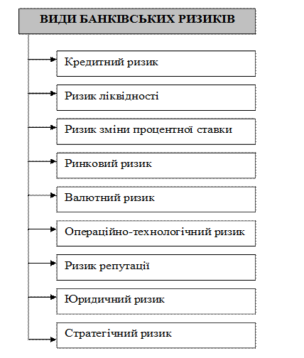 Рис. Категорії банківського ризику Під час оцінки кредитного ризику доцільно розрізняти індивідуальний та портфельний кредитний ризик. Джерелом індивідуального кредитного ризику є окремий, конкретний контрагент банку – позичальник, боржник, емітент цінних паперів. Оцінка індивідуального кредитного ризику передбачає оцінку кредитоспроможності такого окремого контрагента, тобто його індивідуальну спроможність своєчасно та в повному обсязі розрахуватися за взятими зобов’язаннями. Портфельний кредитний ризик виявляється у зменшенні вартості активів банку (іншій, аніж унаслідок зміни ринкової процентної ставки). Джерелом портфельного кредитного ризику є сукупна заборгованість банку за операціями, яким притаманний кредитний ризик, – кредитний портфель, портфель цінних паперів, портфель дебіторської заборгованості тощо. Оцінка портфельного кредитного ризику передбачає оцінку концентрації та диверсифікації активів банку. Міжнародному кредитуванню, крім кредитного ризику, притаманний ризик країни, який виникає через особливості економіки, соціального ладу та політичного устрою країни позичальника. Ризик країни особливо помітний у разі кредитування іноземних урядів або їхніх установ, оскільки таке кредитування зазвичай не забезпечене. Проте цей ризик має завжди враховуватися в кредитній та інвестиційній діяльності – не має значення, у якому секторі – державному чи приватному. існує також компонент ризику країни, відомий як трансферний ризик, що виникає в тому випадку, коли заборгованість позичальника не номінована в національній валюті. Незважаючи на фінансовий стан позичальника, валюта заборгованості може виявитися недоступною для нього. Ризик ліквідності визначається як наявний або потенційний ризик для надходжень та капіталу, який виникає через неспроможність банку виконати свої зобов’язання в належні строки, не зазнавши при цьому неприйнятних втрат. Ризик ліквідності виникає через нездатність управляти незапланованими відтоками коштів, змінами джерел фінансування та/або виконувати позабалансові зобов’язання. Виділяють також ризик ліквідності ринку, який визначається як наявний або потенційний ризик для надходжень та капіталу, який виникає через нездатність банку швидко закрити розриви своїх позицій за поточними ринковими ставками, не зазнавши при цьому неприйнятних витрат. Ризик ліквідності ринку виникає через нездатність визначати або враховувати зміни ринкових умов, які впливають на спроможність залучати кошти в необхідних обсягах та за прийнятними ставками та/або реалізовувати активи швидко і з мінімальними втратами вартості. Ризик зміни процентної ставки – це наявний або потенційний ризик для надходжень або капіталу, який виникає внаслідок несприятливих змін процентних ставок. Цей ризик впливає як на прибутковість банку, так і на економічну вартість його активів, зобов’язань та позабалансових інструментів. Основними типами ризику зміни процентної ставки, на які зазвичай наражається банк, є: 1) ризик зміни вартості ресурсів, який виникає через різницю в строках погашення (для інструментів з фіксованою процентною ставкою) та переоцінки величини ставки (для інструментів із змінною процентною ставкою) банківських активів, зобов’язань та позабалансових позицій; 2) ризик зміни 