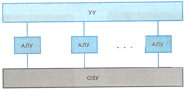 Рис. 3. Архитектура многопроцессорного компьютера 3.3.3. Многомашинная вычислительная система. Здесь несколько процессоров, входящих в вычислительную систему, не имеют общей оперативной памяти, а имеют каждый свою (локальную). Каждый компьютер в многомашинной системе имеет классическую архитектуру, и такая система применяется достаточно широко. Однако эффект от применения многомашинной системы может быть получен только при решении задач, имеющих специальную структуру: она должна разбиваться на столько слабо связанных подзадач, сколько компьютеров в системе. 3.3.4. Архитектура с параллельными процессорами. Здесь несколько АЛУ работают под управлением одного УУ. Это означает, что множество данных может обрабатываться по одной программе, т. е. по одному потоку команд. Высокое быстродействие такой архитектуры можно получить только на задачах, в которых одинаковые вычислительные операции выполняются одновременно на различных однотипных наборах данных. Структура таких компьютеров представлена на рисунке 4.