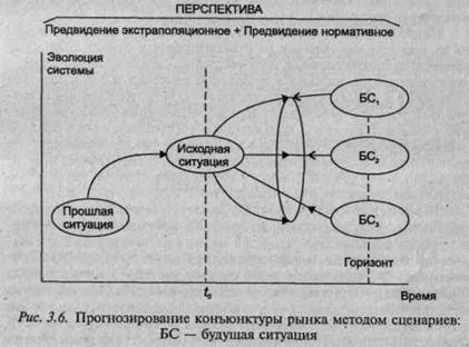 туры рынка необходимо использовать возможности каждого из них. Интеграцию подходов к прогнозированию конъюнктуры рынка обеспечивает разработка сценариев. Сценарий — это динамическая модель будущего, в которой описывается возможный ход событий с указанием вероятностей их реализации. В сценарии представляются ключевые причинные факторы, которые должны быть приняты во внимание, и указываются способы их возможного влияния, скажем, на спрос. Обычно составляется несколько альтернативных вариантов (рис. 3.6), реализация которых возможна при различных допущениях (например, о влиянии демографических, экономических, политических и других факторов на развитие конъюнктуры). Один, наиболее вероятный вариант сценария рассматривается в качестве базового. На его основе принимаются текущие решения. Другие варианты используются, если реальность в большой мере начинает соответствовать их содержанию.