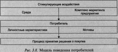 Роль маркетинга сводится к изучению побудительных факторов и мотивов, которые определяют принятие потребителями решений в отношении покупки товаров. 3.3.2. Факторы, оказывающие влияние на поведение потребителей Все многообразие факторов, влияющих на потребителей, можно разделить на две группы: внешние побудительные факторы и личностные факторы. Внешние побудительные факторы, как видно из рис. 3.8, включают факторы маркетинга и факторы среды. Предприятие оказывает непосредственное воздействие на потребителя через факторы маркетинга. К ним относятся элементы комплекса маркетинга (товар, цена, сбыт, коммуникации). Задача состоит в максимально эффективном использовании этих факторов для достижения целей предприятия. Все указанные элементы комплекса маркетинга будут подробно рассмотрены в главах 6—9. Факторы среды не поддаются непосредственному контролю со стороны предприятия. Однако они оказывают весьма существенное влияние на поведение потребителей. Поэтому их следует постоянно учитывать, не только принимая какое-либо серьезное маркетинговое решение, но и в повседневной деятельности. Среди факторов среды особую роль играют экономические, политические, культурные, социальные. Экономические и политические факторы в большей мере оказывают влияние на все прочие факторы (социальные, культурные), чем на поведение конкретного человека. Но нельзя игнорировать тот факт, что уровень развития производительных сил и состояние производственных отношений в обществе влияют на поведение потребителя на рынке. Наиболее существенными экономическими факторами являются динамика инфляционных процессов, состояние рынка товаров, курсы обмена валют, процентные ставки и т.д. Например, воздействие инфляции на поведение покупателей выражается в том, что их финансовые возможности и необходимость соизмерять с ними свои действия находятся в прямой зависимости от темпов и характера инфляционных процессов. Знание механизма влияния экономических факторов на поведение покупателей позволяет не только прогнозировать их вероятные действия, но и использовать это влияние в своих интересах. Среди факторов политического характера наибольшее влияние на потребителей оказывают законы и нормативные акты, принимаемые государством. Культурные факторы оказывают на потребителей самое непосредственное воздействие. Они значительно влияют на процесс формирования в обществе основных ценностей, определяют отношение в нем к таким понятиям, как риск, личная свобода, успех, индивидуализм и пр. Именно культурные факторы главным образом обусловливают существенные различия в поведении потребителей, проживающих в различных странах. Культура — это специфический способ организации и развития общества, находящий выражение в продуктах творчества, духовных