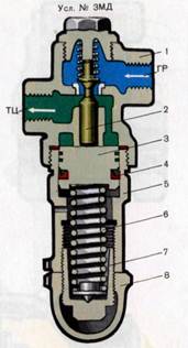 Предназначены для ограничения давления воздуха, поступающего из главного резервуара. Клапан № 3МД состоит из корпуса, клапана, стакана, поршня, уплотнённого резиновой манжетой, регулировочной пружины и регулировочного винта с предохранительным колпачком. Под действием пружины поршень занимает крайнее верхнее положение и отжимает клапан от седла до упора в хвостовик крышки. Воздух из ГР через открытый клапан поступает через отросток ТЦ в тормозной цилиндр. Одновременно по каналу он попадает в камеру «а» над поршнем. Как только давление воздуха на поршень станет несколько больше усилия, на которое отрегулирована пружина, он опустится и клапан сядет на своё седло, прекратив сообщение ГР с отростком ТЦ. При больших объёмах тормозных цилиндров, особенно если они удалены от крана, давление в камере над поршнем повышается значительно быстрее, чем наполняются ТЦ, вследствие чего подъём клапана уменьшается и наполнение ТЦ замедляется. Для сокращения времени наполнения ТЦ применяют клапан максимального давления № 3МДА, у которого камера над поршнем отростком В в корпусе соединена с обратной трубой от ТЦ. В этом случае клапан удерживается в положении максимального подъёма до тех пор, пока не наполнятся ТЦ, после чего поршень перемещается вниз и клапан садится на своё седло.