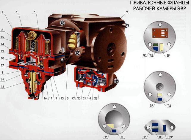 Рабочая камера объёмом 1,5 л образует четыре фланца, к которым крепятся: переключательный клапан 4, электрическая часть с пневматическим реле, воздухораспределитель № 292-001 и сам электровоздухораспределитель. Пневматическое реле 3 имеет корпус, в котором установлено клапанно-диафрагменное устройство, обеспечивающее создание такого же уровня давления в тормозном цилиндре ТЦ, как и в рабочей камере. По существу пневматическое реле выполняет функции повторителя большими проходными сечениями для реализации высоких темпов изменения давления в ТЦ, соответствующих задаваемым в рабочей камере. Чувствительным элементом реле является резиновая диафрагма 17, которая, прогибаясь вверх или вниз, из-за разности действующих на неё давлений со стороны рабочей камеры и тормозного цилиндра, открывает питательный 18 или выпускной клапан 19 для изменения давления в последнем. Переключательный клапан 4 имеет два резиновых уплотнения 20 и 21, упирающихся в сёдла 22 и 23 в его крайних положениях. В одном из них ТЦ сообщается с запасным резервуаром через электровоздухораспределитель, а в другом через воздухораспределитель № 292-001, обеспечивая соответственно работу электропневматического или автоматического тормоза. При торможении возбуждаются электропневматические тормозной 1 ТВ и отпускной 2 ОВ вентили. Первый сообщает запасной резервуар ЗР с рабочей камерой 3 ЗР, а второй отключает её от атмосферы. Давление в рабочей камере возрастает и