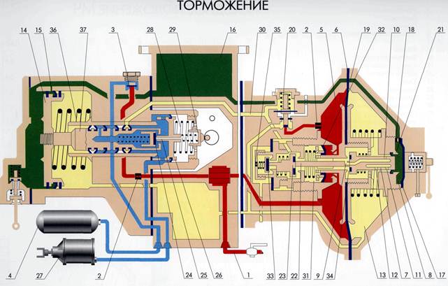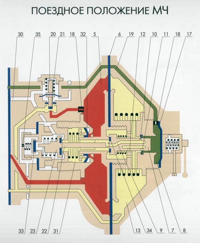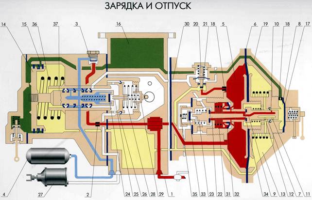 этом время зарядки ЗР объёмом 0,078 м³ до давления 4,8 кгс/см² составляет около 4,5 мин. Одновременно повышающимся давлением в магистральной камере МК 5 диафрагма 6 прогибается вправо, перемещая плунжер 7 внутрь полости 8 режимного переключателя «равнинный-горный». По отверстиям и каналам 9, 10, 11, 12 происходит зарядка золотниковой камеры ЗК 13 из магистральной 5. В главной части ГЧ главный поршень ГП 14 при зарядке находится в крайнем левом положении и через калиброванное отверстие К2 ǿ= 0,5 мм 15 заряжается рабочая камера РК 16. На горном режиме переключателя этот путь зарядки РК единственный и обеспечивает повышение давления в ней до 4,6 кгс/см² за 4 мин. На равнинном режиме при давлении в РК 2,0 – 3,5 кгс/см² диафрагма 17 прогибается вправо и открывается второй путь её зарядки: из полости 8 режимного переключателя через калиброванное отверстие К3 ǿ= 0,6 мм и канал 19, который сокращает указанное выше время роста давления в РК до 3 мин. После того как давление в ЗК достигает 4,2 – 4,8 кгс/см² открывается клапан мягкости КМ 20 и сообщает МК и ЗК через калиброванное отверстие в седле К4 ǿ= 0,9 мм, ускоряя дозарядку последней. Когда давление во всех камерах ВР достигает поездного уровня (поездное положение) диафрагма 6 переместится в среднее положение до упора через толкатель 22 в клапан дополнительной разрядки 23. После этого сообщение камер МК и ЗК осуществляется только через клапан мягкости. При отпуске давление в камере РК выше, чем в камере МК и ЗК и на горном режиме происходит дозарядка последних, как показано выше. На равнинном режиме отпуск отличается тем, что в полости 8 режимного переключателя из магистральной камеры через отверстия плунжера 7 создаётся высокий уровень давления, который не даёт рабочей камере разряжаться в золотниковую, а зарядка последней осуществляется только из тормозной магистрали.