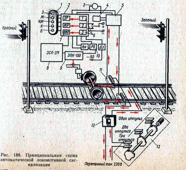 Сигнальные показания локомотивного светофора имеют следующие значения: зелёный огонь – путь свободен, на путевом светофоре зелёный огонь; жёлтый огонь – разрешается движение с ограниченной скоростью, на путевом светофоре жёлтый огонь; жёлтый огонь с красным – разрешается движение с готовностью принять меры к торможению и остановке поезда, на путевом светофоре красный огонь; красный огонь – сигнал, запрещающий движение; появляется после проезда закрытого путевого светофора; белый огонь – показания путевых сигналов на локомотивный светофор не подаются; необходимо руководствоваться сигналами путевых светофоров. Кодовые токи образуют вокруг каждого рельса переменное магнитное поле, на которое реагируют приёмные катушки, подвешенные на локомотив. Индуктированные в приёмных катушках и усиленные в усилителе импульсы ЭДС приводят в действие дешифрующее устройство. Последнее включает на локомотивном светофоре соответствующий сигнальный огонь, повторяющий показание путевого светофора. Передающими или путевыми устройствами являются: трансмиттер 13 – через трансмиттерное реле и кодовый трансформатор 12 питает рельсовую цепь кодированным переменным током; линейное реле – переключает рельсовую цепь на контакты той или иной шайбы трансмиттера в зависимости от показаний путевого светофора;