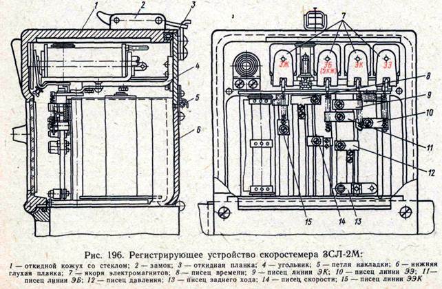 На рис. 198 изображена диаграммная лента со всеми записями и проколами. За линию 18 записи нулевого давления принята линия скорости, равной 50 км/ч, а давление 5,0 – 5,2 кгс/см² - линия 20 скорости 130 км/ч. Линия 23 нулевой скорости проходит на расстоянии 2,5 мм от нижнего края ленты. На 40 мм выше нулевой линии скорости проходит линия максимальной скорости 150 км/ч (220 км/ч). На 5 мм выше линии максимальной скорости находится нулевая линия часов и минут, выше её на 30 мм – линия, соответствующая 24 ч. Расстояние между двумя соседними часовыми проколами по вертикальной линии равно 1,25 мм. Вертикальные отрезки записи минут, лежащие между отметками получасов, показывают длительность остановок. На стоянке локомотивная лента не передвигается, вследствие этого минутный писец пишет на ленте вертикальную линию, поднимаясь за каждую минуту на 1 мм. Запись минут происходит по наклонной линии. Наклон будет различным в зависимости от скорости перемещения ленты, т.е. от скорости движения локомотива. Проколы часов также сдвинуты относительно предыдущего на отрезок ленты, который передвинулся в течение одного часа. Каждые полчаса минутный писец поднимается на 30 мм по вертикальной линии и падает вниз в исходное положение, прочерчивая на ленте вертикальную линию. На стоянках минутный писец чертит вертикальную линию (8,11,12) по длине которой определяется длительность стоянки в минутах. Например, длина вертикальной линии 8 (10 и 20 мм) означает, что стоянка была 30 ми, а линии 11 (15 и 20 мм) – 35 мин. Соответственно трём поясам игл лентопротяжного валика в нижней, средней и верхней частях ленты получаются перфорационные проколы, регистрирующие в масштабе путь, пройденный локомотивом. Расстояние между двумя соседними проколами в 5 мм соответствует 1 км пройденного пути. По числу проколов определяется путь в километрах, пройденный локомотивом. Запись скорости 17 на ленте получается в виде кривой, причём, чем больше скорость, тем выше будет располагаться кривая относительно нулевой линии 23 (линии нижних проколов). Применение машинистом торможение поезда отмечено зигзагообразной линией 21, показывающей режим торможения. Запись давления в тормозной магистрали 20 на ленте так же, как и запись заднего хода 15, сдвинуты вправо на 20 мм от места записи скорости и минут. Электропневматическое торможение записывается небольшим спадом писца давления. Устройства АЛСН обеспечивают: