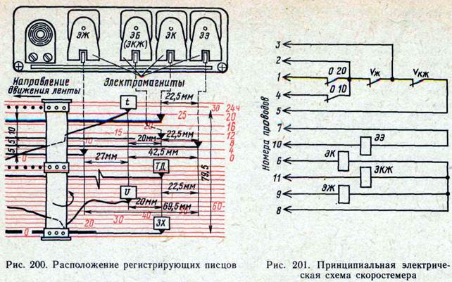 периодическую проверку бдительности машиниста через 15 – 20 с, которая вводится при скоростях следования 10 км/ч и выше – при красном огне локомотивного светофора и скорости менее 20 км/ч, при жёлтом огне локомотивного светофора и скорости ниже νкж, при жёлтом огне локомотивного светофора и скорости выше νж, а также для всех скоростей при белом огне локомотивного светофора.; периодическую проверку бдительности машиниста через 60 – 90 с на некодированных участках, которая вводится со скорости 10 км/ч и выше; однократную проверку бдительности машиниста при смене сигнальных показаний локомотивного светофора (за исключением смены на зелёный огонь); возможность зажигания белого огня локомотивного светофора на некодированных участках путём одновременного нажатия рукоятки бдительности и кнопки Вк (искусственное зажигание белого огня). На рисунке приведено расположение линии и писцов, регистрирующих параметры АЛСН. Писцы скорости v и минут t лежат на одной вертикали, смещённой влево на 20 мм от писцов давления ТД и заднего хода ЗХ. Писцы жёлтого ТД огня с красным ЭКЖ располагаются под часовой линией с оцифровкой 12, а писцы красного огня ЭК – под часовой линией с оцифровкой 20. Писцы ЭК, ЭКЖ находятся на одной вертикали с писцами заднего хода ЗХ и торможения ТД и сдвинуты вправо на 20 мм от места расположения писцов скорости и времени. Писец, записывающий включение автостопа ЭЭ (см. рис. 200), располагается под часовой линией с оцифровкой 8 и сдвинут вправо от писца скорости и времени на 42,5 мм, а писец, фиксирующий горение жёлтого огня ЭЖ, располагается под часовой линией с оцифровкой 0 и сдвинут влево от писцов скорости и времени на 27 мм. Писцы управляются электромагнитами. В цепь ЭПК автостопа параллельно включён электромагнит ЭЭ, в цепь жёлтого огня - электромагнит ЭКЖ и в цепь красного огня локомотивного светофора - электромагнит ЭК. Указанное включение электромагнитов позволяет осуществить расшифровку по ленте всех огней локомотивного светофора.