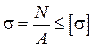 При растяжении или сжатии в поперечном сечении стержня возникает продольная сила N, которая определяется методом сечений. Величина продольной силы равна алгебраической сумме всех внешних сил, действующих на стержень по одну сторону от рассматриваемого сечения. Внешняя сила считается положительной, если она направлена от рассматриваемого сечения, и отрицательной, когда направлена к этому сечению. Это правило относится к продольной силе. Условимся, что вектор N направлен от рассматриваемого сечения. Тогда получаемый в результате подсчета знак укажет на характер деформации: плюс – растяжение, минус – сжатие. Продольная сила связана с нормальными напряжениями σ, которые распределяются по сечению равномерно. Условие прочности имеет вид