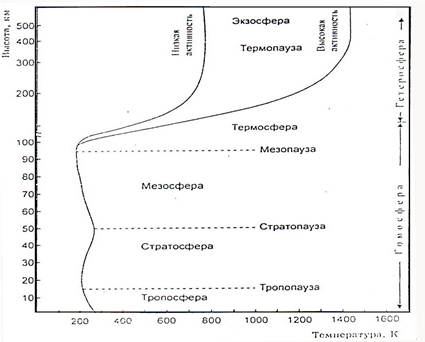 Химический состав стратосферы и мезосферы обусловлен прони-кновением ряда компонентов из приземной атмосферы и определен фотодиссоциацией. Кроме молекулярных азота, кислорода и атомарного аргона, здесь присутствуют кислородные, водородные, углеродные и азотные соединения, а также соединения Cl, Br,F и др. Выше мезопаузы находится термосфера - сфера роста температуры и постепенного достижения ее постоянных значений, соответствующих термопаузе. Это наиболее разряженная атмосфера с относительно повышенной ионизацией газов и существенным повышением температур (от -75-90° до более +400°С). Инструментально выделять термосферу позволяют радиоволны. В нижней части термосферы преобладают относительно тяжелые компоненты, в верхней - более легкие, вначале атомарный кислород, затем - гелий и водород. Основными поглотителями ультрафиолетового излучения здесь являются молекулярный кислород и азот. Кроме сильных суточных, сезонных и широтных вариаций, вызы-ваемых солнечным УФ излучением, возмущения термосферы связаны с геомагнитной активностью. Важнейшей особенностью верхней атмосферы является очень сильное падение плотности с высотой, достигающее значений в сотни миллиардов раз. Она является внешней газовой оболочкой Земли, главными особенностями которой, помимо резкого падения плотности с высотой, является наличие нескольких температурных максимумов. В самой верхней, очень разряженной части верхней атмосферы происходит «убегание» легких газов - H и He, отдельные атомы которых имеют достаточную для этого скорость, в соответствии с распределением Максвелла. Это – экзосфера.