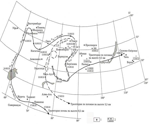 Рис. 3.10. Траектории переноса продуктов ядерных испытаний воздушными потоками от Семипалатинского ядерного полигона