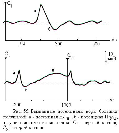 Предполагается, что начальная позитивная фаза первичных ответов обусловлена суммацией синаптических потенциалов тел пирамидных нейронов и тех дендритов, которые отходят от тел пирамидных нейронов вглубь коры. Следующая за позитивной негативная фаза первичного ответа вызвана активацией тех дендритов пирамидных нейронов, которые расположены в поверхностных слоях коры. Вторичные ответы, как правило, регистрируются в ассоциативных зонах коры, примыкающих к проекционным. Они отражают процессы, связанные с передачей возбуждения от первичных проекционных зон к ассоциативным и с рабочей настройкой нейронов коры путём изменения их возбудимости. Выявлена связь некоторых отдельных колебаний вызванных потенциалов с такими процессами как внимание, обработка поступившей информации, ожидание подачи сигнала. Например, обработка слуховой информации ведёт к появлению позитивной волны П300, концентрация внимания отражается на параметрах негативной во-лны Н200 (рис. 55). Специфические вызванные потенциалы мо-жно зарегистрировать при формировании условного рефлекса. Примером таких потенциалов может служить описанная Г. Уолтером волна ожидания, или условная негативная волна, или Е-волна. Так, если первый условный сигнал (например, команда «внимание») информирует о том, что человек должен будет совершить движение при действии последующего второго раздражителя (например, команды «марш»), то после ряда сочетаний первый раздражитель начинает вызывать волну ожидания, которая продолжается до подачи второго раздражителя (рис. 55, в). Волна ожидания представляет собой медленное негативное колебание с амплитудой до 40 мкВ. Волна ожидания предшествует движению, которое должен произвести субъект, и, по-видимому, является электрофизиологическим отражением процессов подготовки к целенаправленному движению. Однако более полно связь волны ожидания с психическими процессами у человека пока не расшифрована. Функциональная асимметрия больших полушарий