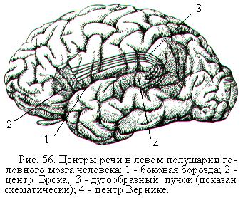 После открытия во второй половине 19-го века французским учёным Полем Брокá моторного центра речи (центр Брока) и немецким учёным-невропатологом Карлом Вернике сенсорного центра речи (центр Вернике), расположенных в левом полушарии (рис. 56), это полушарие стали считать главным в отношении речевой функции и мышления. Центр Брока находится в задней части нижней лобной извилины, он обеспечивает способность человека говорить. Центр Вернике расположен в задней части верхней височной извилины. Благодаря нему человек понимает свою и чужую речь. Центр Вернике и центр Брока связаны проходящим под корой пучком нервных волокон, который получил название дугообразного пучка. После обнаружения центров речи долгое время не появлялось никаких новых данных о неравнозначности полушарий. Речь казалась единственным исключением из общего правила, согласно которому оба полушария совершенно равноценны в отношении всех остальных сенсорных и двигательных функций. Только в 50-х годах 20-го века Роджер Сперри с сотрудниками провели ряд экспериментов с перерезкой у кошек мозолистого тела – толстого пучка, содержащего миллионы нервных волокон и соединяющего оба полушария. Когда таким животным помещали разные объекты перед правой и левой половиной поля зрения, то оказалось, что правое и левое полушарие работают независимо друг от друга, т.е. зрительная информация не передавалась от одного полушария к другому. У людей, больных эпилепсией, во время припадка бурная импульсная активность нейронов распространяется от поражённого участка на другие области мозга. Она может через мозолистое тело передаться другому полушарию и человек может погибнуть. Чтобы сдержать нервный взрыв и спасти больного, нейрохирурги перерезают мозолистое тело. После такой операции у больных не отмечается практически никаких видимых изменений в отношении свойств личности, интеллекта или поведения.