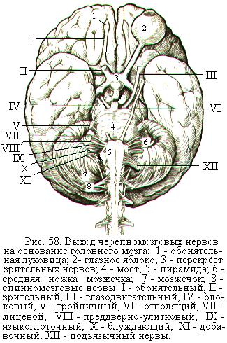 I пара – обонятельный нерв, образован отростками обонятельных рецепторных клеток, расположенных в слизистой оболочке носовой полости, идёт к обонятельным луковицам переднего мозга. II пара – зрительный нерв, образован отростками нервных клеток сетчатки глаза. Войдя из глазницы в полость черепа, правый и левый зрительные нервы частично перекрещиваются (зрительный перекрёст) и продолжаются в зрительные тракты. III пара – глазодвигательный нерв, иннервирует верхнюю, нижнюю и медиальную прямые мышцы глазного яблока, нижнюю косую мышцу глаза и мышцу, поднимающую верхнее веко. Входящие в состав глазодвигательного нерва парасимпатические волокна иннервируют мышцу, суживающую зрачок, и ресничную мышцу, способствующую изменению кривизны хрусталика. IV пара – блоковой нерв, иннервирует верхнюю косую мышцу глаза. V пара – тройничный нерв, выходит из мозга двумя корешками: двигательным (меньшим) и чувствительным (бóльшим). Волокна тройничного нерва образуют три ветви: глазной нерв, верхнечелюстной нерв и нижнечелюстной нерв. Чувствительные волокна тройничного нерва иннервируют кожу лица, переднюю часть головы, глаза, слизистые оболочки носовой и ротовой полостей, придаточных пазух носа. Двигательные волокна тройничного нерва иннервируют жевательные мышцы, мышцы дна рта, мышцу натягивающую мягкое нёбо и одну из мышц барабанной полости среднего уха. VI пара – отводящий нерв, иннервирует наружную прямую мышцу глаза, которая отводит (поворачивает) глазное яблоко вбок. VII пара – лицевой нерв. Двигательные его волокна иннервируют мимические мышцы лица и некоторые мышцы шеи. Чувствительные волокна, входящие в состав лицевого нерва под названием промежуточный нерв, иннервируют слизистую оболочку передних 2/3 языка, железы слизистой оболочки носовой и ротовой полостей, подъязычные и подчелюстные слюнные железы, слёзные железы. VIII пара – преддверно-улитковый нерв, идёт от внутреннего уха. Состоит из отростков нейронов улиткового узла, несущих информацию от рецепторов слухового аппарата, и из отростков нейронов преддверного узла, проводящих импульсы от рецепторов вестибулярного аппарата. IX пара – языкоглоточный нерв, содержит двигательные, чувствительные и парасимпатические волокна. Двигательные его волокна участвуют в иннервации мышц глотки. Чувствительные волокна иннервируют слизистую оболочку задней трети языка, глотки, среднего уха. Парасимпатические волокна иннервируют слюнные околоушные железы. X пара – блуждающий нерв, самый длинный из черепномозговых нервов. Снабжает своими ветвями органы дыхания, бóльшую часть пищеварительного тракта, доходя до ободочной кишки, печень, поджелудочную железу, почки, а также даёт ветви к сердцу и начальной части аорты. Двигательные волокна блуждающих нервов иннервируют поперечнополосатые мышцы глотки, мягкого нёба и гортани; парасимпатические – гладкую мускулатуру внутренних органов, сердечную мышцу и секреторные железы пищеварительного тракта; чувствительные волокна проводят импульсы от рецепторов внутренних органов, заднего отдела твёрдой оболочки головного мозга и от наружного уха. XI пара – добавочный нерв, иннервирует грудино-ключично-сосцевидную и трапециевидную мышцы. XII пара – подъязычный нерв, иннервирует мышцы языка. В составе подъязычного нерва проходит часть двигат