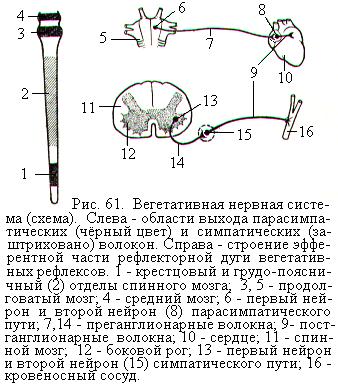 ВЕГЕТАТИВНАЯ НЕРВНАЯ СИСТЕМА Строение вегетативной нервной системы Вегетативной нервной системой (ВНС) называют часть нервной системы, которая регулирует и координирует деятельность внутренних органов, обмен веществ, гладкую мускулатуру, железы внутренней секреции, постоянство внутренней среды организма и функциональную активность тканей. ВНС иннервирует весь организм, все органы и ткани. Структурные и функциональные особенности ВНС дали определённые основания рассматривать её как «автономную», т.е. не зависящую в своих функциях от деятельности центральной нервной системы и от воли человека. Однако представление об автономности вегетативной нервной системы является весьма условным. В настоящее время не подлежит сомнению, что посредством ВНС центральная нервная система регулирует функции внутренних органов, а также кровоснабжение и трофику всех тканей организма. По анатомическому строению ВНС представляет совокупность следующих структурных образований: 1) нервных волокон; 2) периферических нервных узлов (ганглиев), состоящих из нервных клеток; 3) центров в сером веществе спинного, продолговатого и среднего мозга, от тел нейронов которых начинаются нервные волокна; 4) высших центров, находящихся в отделе промежуточного мозга – гипоталамусе. Вегетативные рефлекторные дуги построены по такому же плану, что и соматические, и содержат чувствительные, вставочные и эфферентные звенья. Различие их заключается в том, что эфферентные нейроны ВНС лежат в ганглиях за пределами центральной нервной системы. В вегетативной нервной системе выделяют симпатический отдел, или симпатическую нервную систему, и парасимпатический отдел, или парасимпатическую нервную систему. Иногда выделяют ещё метасимпатическую часть ВНС. Сфера иннервации метасимпатической части ВНС охватывает только те внутренние органы, которые обладают собственным моторным ритмом, например желудок, кишечник. Симпатический и парасимпатический отделы ВНС различаются между собой: 1) по расположению центров в мозге, от которых идут к органам нервные волокна; 2) по близости расположения ганглиев к органам-мишеням; 3) по медиатору, который используют постганглионарные нейроны в синапсах на клетках органов-мишеней для регулирования их функций; 4) по характеру оказываемых влияний на внутренние органы.