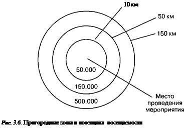 • определение стратегии и организация ее реализации; • расчет доходов и расходов; • управление и контроль. Следующие пункты посвящены прохождению данных шагов. 3.4.1. Анализ шансов на рынке Такой анализ, как правило, необходим для крупных коммерческих мероприятий (см. «Контрольные таблицы»). Но и в случае некоммерческих мероприятий, проводимых религиозными общинами и городами, целесообразно производить исчерпывающий анализ. Многие примеры, к сожалению, подтверждают, что не всегда планируемые мероприятия учитывают потребительский спрос. В рамках фундаментального обзора рыночных шансов необходимо исследовать следующие моменты. • Есть ли спрос на мое мероприятие? Ответ возможно получить посредством сравнения с подобным мероприятием в другом регионе. В отношении собственного региона полезно уточнить, какие мероприятия существуют в аналогичной форме, а каких пока еще недостает. • Имеются ли целевые группы с установленными численностью, возрастом, образованием, уровнем доходов и т. д.? Статистические данные можно затребовать в городах и муниципальных образованиях либо узнать через их веб-сайты. Распространители входных билетов также могут предоставить информацию о спросе на рынке. • Имеюся ли аналогичные мероприятия, которые уже удовлетворили спрос? Сколько конкурентных мероприятий намечено на запланированные сроки? Здесь следует учитывать также телевизионные трансляции футбольных матчей или гонок Формулы-1. • Есть ли подходящие места для проведения мероприятия? Какова инфраструктура на конкретном месте проведения? К какой пригородной зоне относится данное место и каков его потенциал для посетителей (рис. 3.6)?
