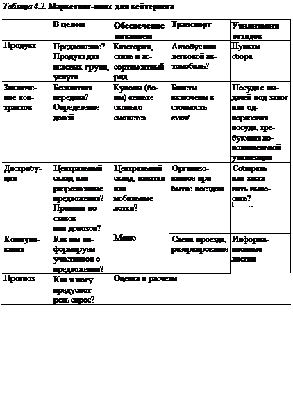 4.2.9. Система контроля на входе Входные билеты являются классическим средством контроля наплыва посетителей. На массовых мероприятиях или для предупреждения возможных злоупотреблений должны устанавливаться самые совершенные системы. Контроль на входе предполагает действия от надрывания билетов до применения электронных систем слежения. Системы контроля реализуются по-разному. Использоваться могут, например: • бумага (с отрывным купоном на билете либо без него); • магнитные полосы или системы траспондеров; • замки, система паролей; • система карточек. Системы контроля на входе могут брать на себя различные функции, например: • доступ к различным зонам и участкам ^«/-мероприятия (в пространстве и времени): • оплата товаров и услуг; • функции резервирования и идентификации (например, контроль возраста). В то время как входные билеты и купоны (боны) продаются согласно дебетовой системе и подлежат оплате заранее, электронные системы оплаты могут работать как дебетовые и кредитовые. 4.3. Маркетинг для кейтеринга и инфраструктуры Кейтеринг и инфраструктура представляют собой дополнительные услуги, которые устроитель evewr-мероприятия (или некто, связанный с ним договором) оказывает посетителям. Поскольку они способны в существенной мере воздействовать на эмоциональную сферу и содействовать финансовому успеху, то и планироваться должны настолько же тщательно, как и само мероприятие. Это касается и сферы маркетинга, хотя в большей мере и в первую очередь имеет отношение к сферам организации транспорта (приезд и отъезд, перевозки людей от места проведения и в самой зоне проведения мероприятия), размещения (ночлег, места для встреч, отдыха и обсуждений), обеспечения питанием (еда, напитки, посуда), а также к таким участкам инфраструктуры, как устранение отходов и гигиена.
