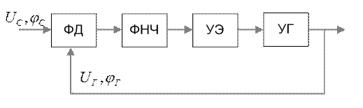 Здесь ФД - фазовый дискриминатор. Может быть выполнен по схеме практически любого фазового детектора. Остальные элементы (ФНЧ, УЭ, УГ) такие же, как и в системе ЧАП. Эта схема, как и схема ЧАП, предназначена для управления частотой, однако чувствительный элемент (измерительный элемент) этой системы реагирует не на разность частот колебаний принимаемого сигнала и генератора, а на разность фаз. Этим элементом является фазовый детектор, напряжение на выходе которого зависит (должно быть пропорциональным) от разности фаз колебаний принимаемого сигнала и управляемого генератора. Основной функцией, выполняемой системой ФАПЧ, является выполнение условия Так как частота колебания связана с его фазой соотношением