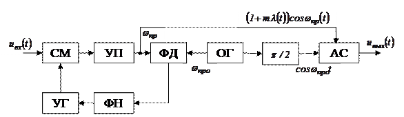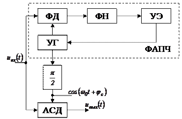 В схеме (рис. 3.27) осуществляется слежение за фазой пришедшего сигнала с помощью системы ФАП, чем обеспечивается синхронное (с одинаковыми фазами) перемножение сигналов в АСД. Для одновременной стабилизации значения промежуточной частоты и возможности применения АСД может быть использована схема, изображенная на рис. 3.28.