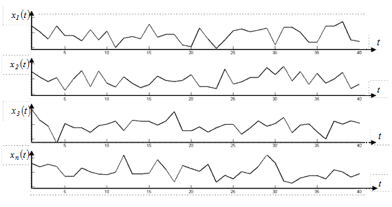 Случайный процесс – функция, значение которой в каждый момент времени является случайным. Эта функция может быть будущим результатом некоторого случайного эксперимента. После проведения эксперимента этот результат (функция) называется реализацией случайного процесса. Естественно, что уже после реализации эксперимента полученную функцию нельзя назвать случайной. Случайный процесс характеризуется множеством таких реализаций, появление которых от эксперимента к эксперименту носит случайный характер. Примеры реализаций случайного процесса показаны на рис. 4.28.