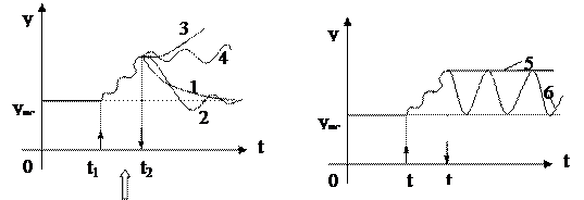 а б Рис. 4.43. Поведение системы при воздействии возмущения c момента времени t1 по t2: а – устойчивые системы 1,2, неустойчивые системы 3,4; б – нейтральные системы на грани устойчивости (5,6)