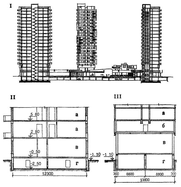 Рис. 26. Разрезы жилых зданий различных конструктивных систем со встроенными и встроенно-пристроенными нежилыми помещениями. I - жилой комплекс "Лебедь" в каркасных конструкциях (Архитекторы Меерсон А., Подольская Е., Федоров И. и другие). II - схема фрагмента разреза жилого дома в панельных конструкциях со встроенными нежилыми помещениями. III - схема фрагмента жилого здания смешанной конструктивной системы - переход от каркасной системы к панельной через сборно-монолитную коробчатую плиту с поперечными ребрами (Авторы Аншин Л., Львов Г., Дыховичный Ю. и другие). а - жилой этаж, б - технический этаж, в - первый этаж, г - подземный этаж.