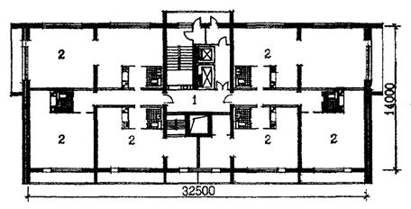 Рис. 27. Примеры решения нежилых помещений в верхних этажах жилых зданий. Размещение мастерских для художников в жилом доме на изделиях серии II-68. План этажа на отметке 46,800. (МНИИТЭП, М4. Архитекторы Датюк В., Богуславский Р. и другие): 1 - тамбур-шлюз, 2 - мастерская художника.