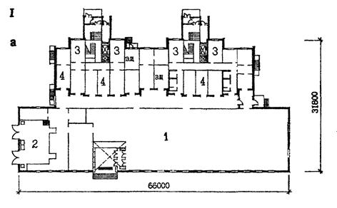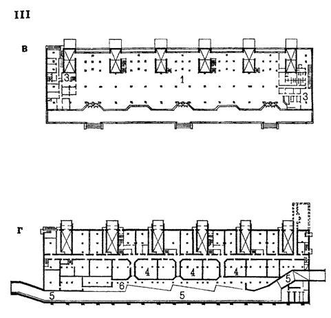 Условные обозначения: 1 - торговый зал; 2 - загрузочное помещение; 3 - административные помещения; 4 - кладовые; 5 - тоннель; 6 - дебаркадер. Рис 31. Варианты загрузки встроенных и встроенно-пристроенных в жилые здания предприятий торговли. I - загрузка с торца здания: а - план первого этажа блок-секции серии П44 со встроенно-пристроенным промтоварным магазином (МНИИТЭП, М1) II - загрузка с улицы: б - схема плана магазина "Семена" общей площадью 130 м2. III - загрузка через подземный тоннель: в - план первого этажа магазина, г - план подземного этажа магазина.