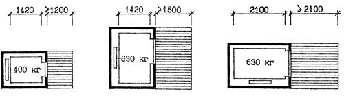 Рис 32 Варианты примыкания нежилых помещений к жилому дому: а - с устройством "лотка"; б - с размещением технического этажа между жилой частью и нежилыми помещениями. 3.42. Существенное значение для планировочного решения жилого здания имеет расположение в его структуре лифтового узла (см. рис. 5-8). Минимальное число лифтов, их грузоподъемность и скорость для конкретного жилого здания определяется в зависимости от его типа, этажности и суммарной площади квартир на этаже по приложению 6 МГСН 3.01-96. Минимальная граница этажности многоквартирных жилых домов, при которой следует устанавливать не менее одного лифта грузоподъемностью 630 кг - 4 этажа (отметка пола верхнего этажа 11,2 м). Применение данного типа лифта позволяет значительно повысить уровень комфорта жилища, обеспечивая возможность транспортировки крупногабаритных предметов. Компоновка групп лифтов может быть как однорядной, так и двухрядной. При этом минимально нормируемая ширина лифтового холла зависит от компоновки групп лифтов и их грузоподъемности (таблица 13). В одноквартирных или блокированных жилых домах лифты могут быть установлены, если это предусматривается заданием на проектирование. 3.43. Планировочные решения мансардного (или верхнего) этажа в значительной степени зависят от остановки лифта на уровне пола этажа или на другом уровне, от места размещения машинного помещения, а также от применяемых типов квартир (одноуровневых или многоуровневых). В структуре жилого дома машинное помещение лифтов может размещаться: на уровне чердака (или выше его); в техническом подполье; на уровне последнего (в том числе мансардного) этажа. При расположении машинного помещения в техническом подполье особое внимание следует обращать на мероприятия, обеспечивавшие исключение доступа в него влаги. Устройство машинного помещения лифтов на уровне чердака требует дополнительных конструктивно-планировочных мероприятий, обеспечивающих акустический комфорт в квартирах. К их числу относятся - отделение машинного помещения от квартир техническими коридорами или примыкание к нему подсобных или дополнительных помещений квартир, таких как кухня, внутриквартирные коридоры, гардеробные, тренажерный зал и другие. В жилом доме секционного типа (или коридорного) с одноуровневыми квартирами остановки лифтов выполняются на уровне пола каждого этажа или на уровне пола промежуточной лестничной площадки между этажами. Исключение может составлять мансардный этаж с одноуровневыми квартирами, в котором остановка лифтов на этом этаже может не предусматриваться. При этом высота подъема от последней остановки лифтов до входа в квартиры не должна превышать 3,0 м, то есть последняя остановка лифта располагается на промежуточной лестничной площадке, или в уровне пола нижележащего этажа. В секционных и коридорных жилых домах с многоэтажными (многоуровневыми) квартирами остановки лифтов могут выполняться как через этаж, так и на каждом этаже. При этом уровень остановки лифтов может совпадать с полом этажей входов в квартиры или быть смещенным по высоте. 3.44. Габариты платформ подъемников определяются с учетом возможности размещения ни них кресла-коляски для перемещения инвалидов-колясочников вертикально или наклонно вдоль лестничного марша (рис. 33). Таблица 13 ШИРИНА ЛИФТОВОГО ХОЛЛА В ЗАВИСИМ