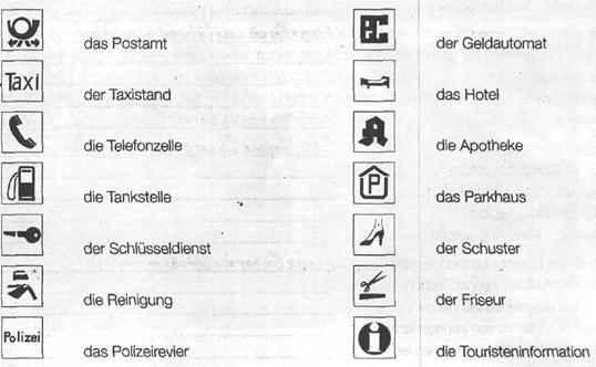 Образец: 1: (ist / Postamt) am Bahnhofplatz ▲Wo ist das nächste Postamt? ● Das nächste Postamt ist am Bahnhofplatz. Образец: 2: (finde / Geldautomat) an der Post ▲ Wo finde ich hier einen Geldautomaten? ● Einen Geldautomaten finden Sie an der Post 1. (ist / Parkhaus) am Bahnhofplatz 2. (finde /Touristeninformation) am Bahnhof 3. (ist / Reinigung) an der Ampel links 4. (finde / Friseur) an der nächsten Kreuzung links 5. (ist / Telefonzelle) an der nächsten Kreuzung rechts 6. (finde / Schuster) an der Elbbrücke 7. (ist / Polizeirevier) in der zweiten Straße links 8. (ist / Tankstelle) in der zweiten Straße rechts 9. (finde / Apotheke) an der Oper 10. (ist / Schlüsseldienst) in der Goethestraße