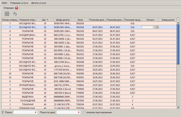 Планирование межцехового взаимодействия Форма «Смежники» предоставляет инженеру ПДБ функционал для планирования выполнения работ между цехами, сменами и подразделениями с целью предоставления услуг. На Рис. 53 показана форма «Смежники», в которой в виде списка отображаются заказы. Инженер ПДБ отмечает начало и завершение операций, которые передаются на выполнение в другие подразделения или принимаются из других подразделений.