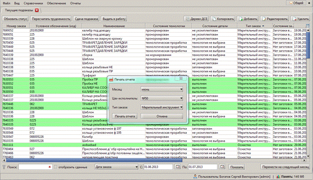 Рисунок 53 – Форма «Смежники» Для организации оперативного планирования и управления производством на цеховом уровне форма «Текущие заказы» отображает в табличном виде список всех заказов, запланированных на выполнение по всем участкам цеха. АРМ «Инженер ПДБ» предусматривает функционал для формирования печатной формы календарного плана. Для выбора диалога формирования плана необходимо выполнить переход «Текущие заказы» –> «Отчеты» –> «Номенклатурный план на месяц». Далее следует в диалоге выбрать месяц, цех и участок, по которому будет сформирован план (Рис. 54).