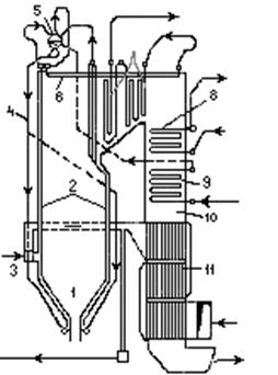 Рис. 5.2. Практический способ получения перегретого пара. Схема барабанного котла с естественной циркуляцией топочная камера; 2 – топочные экраны; 3 – горелки; 4 – опускные трубы; 5 – барабан; 6 – радиационный пароперегреватель; 7 – конвективный пароперегреватель; 8 – промежуточный перегреватель; 9–экономайзер; 10 – конвективный газоход; 11 – воздухоподогреватель.