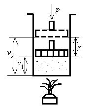 Рис. 5.7. К объяснению значения совершаемой работы l = Q∙S, где: l – работа 1 кг газа при поднятии поршня с постоянным грузом; Q – общее давление на поршень; S – расстояние, на которое передвинулся поршень при совершении газом работы l. Если обозначим давление газа, приходящегося на 1 м2 площади поршня, через р, а площадь поршня через F м2, то общее давление Q на поршень будет равно pF. При этом l = p·F·S кгм/кг. Но F·S – объем цилиндра, имеющего площадь основания F и высоту S. Обозначим этот объем через v (удельный объем газа). Тогда l = p·F·S = pv. Как видно из рис. 4.7, v= v 2 –v 1, а поэтому