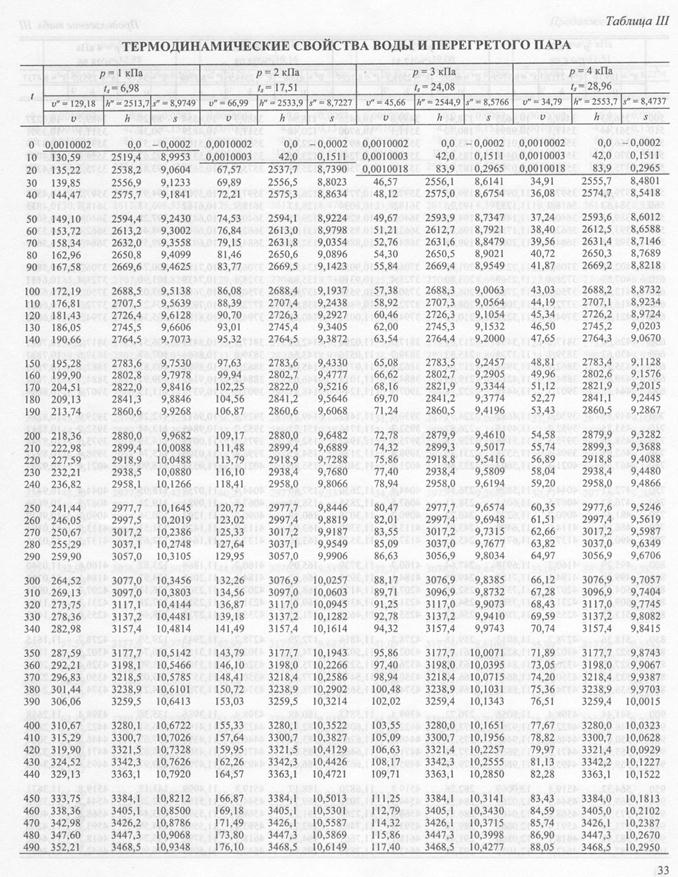В табл. III приведены термодинамические свойства воды и перегретого пара. По этим таблицам для заданных давлений и температур можно найти удельный объем, энтальпию и энтропию однофазной среды – воды и перегретого пара. В первом столбце указаны температуры перегретого пара, расположенные в порядке их возрастания, начиная от 0о С до 1000о С. Для каждой температуры даются значения v, i и s, расположенные в последующих столбцах при различных давлениях перегретого пара.В строках по горизонтали указаны давления начиная от 1 кПа до 100 МПа. Таким образом, эта таблица дает возможность непосредственно или интерполяцией найти значения указанных в ней параметров, не прибегая к вычислениям. По таблице IV можно определить истинную массовую изобарную теплоемкость воды и водяного пара