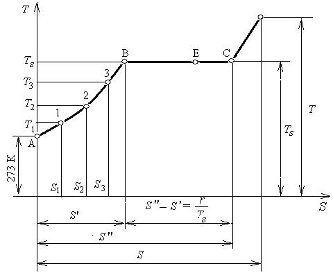 Таким образом, весь процесс получения перегретого пара изобразится ломаной линией ABCD. Значение энтропии пара в точке С может быть подсчитано по уравнению