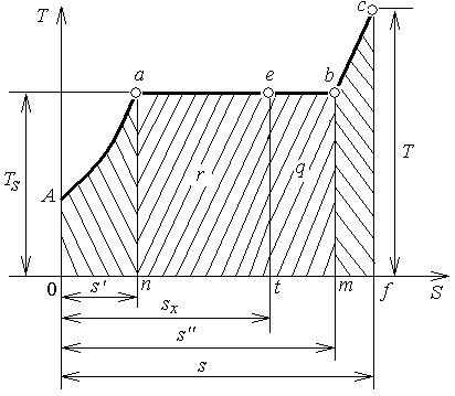 Таких линий для различных значений степени сухости можно нанести на диаграмме несколько; тогда получим ряд кривых, также сходящихся в критической точке. В sT – диаграмме площадь, ограниченная линией процесса, осью абсцисс и крайними ординатами, определяет количество теплоты, участвующей в процессе. Применим это свойство sT – диаграммы к процессу парообразования, который изобразим линией Ааbс (рис. 6.3). Процесс превращения кипящей воды в пар при этом изобразится линией ab. Согласно указанному свойству площадь прямоугольника abmn должна определять теплоту парообразования r. Действительно, для конечной точки этого процесса – точки b, когда пар превратится в сухой, значение энтропии находят по уравнению: