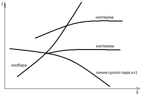 В теплотехнических расчетах часто пользуются диаграммой, в которой по оси ординат отложены величины энтальпии, а по оси абсцисс – изменение энтропии. Для того чтобы найти величину энтальпии по такой диаграмме, а следовательно, и количество теплоты, необходимо измерить лишь длину соответствующего отрезка по оси ординат. На is -диаграмме имеются линии постоянных давлений (изобары) и линии постоянных температур (изотермы) (см. рис. 3).