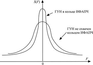 Рис. 2.17. Коэффициент передачи разомкнутого кольца ИФАПЧ В логарифмическом масштабе коэффициент передачи разомкнутого кольца ИФАПЧ без ФНЧ – прямая с наклоном 20 дБ/декада, где под декадой понимают изменение частоты помехи в 10 раз. Это классическая зависимость коэффициента передачи На частоте среза При перестройке ГУНа с одной частоты на другую (F = 0) кольцо ИФАПЧ полностью компенсирует расстройку. Изменение энергетического спектра ГУНа, охваченного кольцом ИФАПЧ, иллюстрирует рис. 2.18. В полосе эффективного регулирования наблюдается заметное сужение спектральной линии.