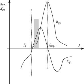 Так какZ q 0 = ω q L q = 1/(ω q C q) очень велико, добротность кварцевого резонатора Q q = Z q 0/R q достигает десятков и сотен тысяч. Емкость кварцедержателя обычно составляет единицы пикофарад. Если заменить схему (рис. 2.8) последовательной цепочкой Z q э = R q э + j X q э, то вблизи резонансной частоты f q сопротивления R q э и X q э изменятся так, как показано на рис. 2.9. На частоте f q (2.22) происходят последовательный резонанс кварцевого резонатора, при этом сопротивление резонатора минимально. На частоте fпар > f q наблюдается параллельный резонанс, когда сопротивление Z q э активно и велико, при этом частота